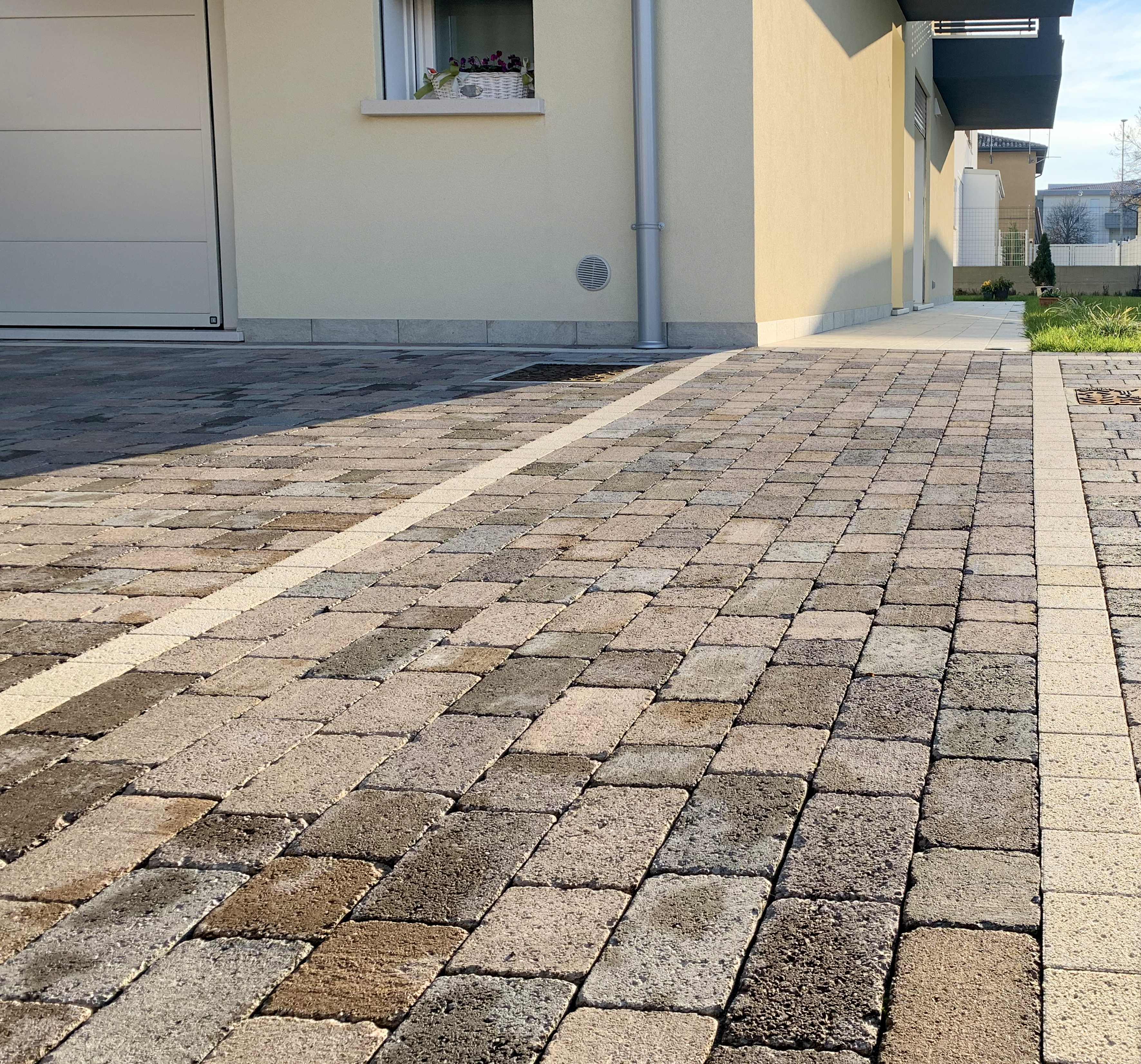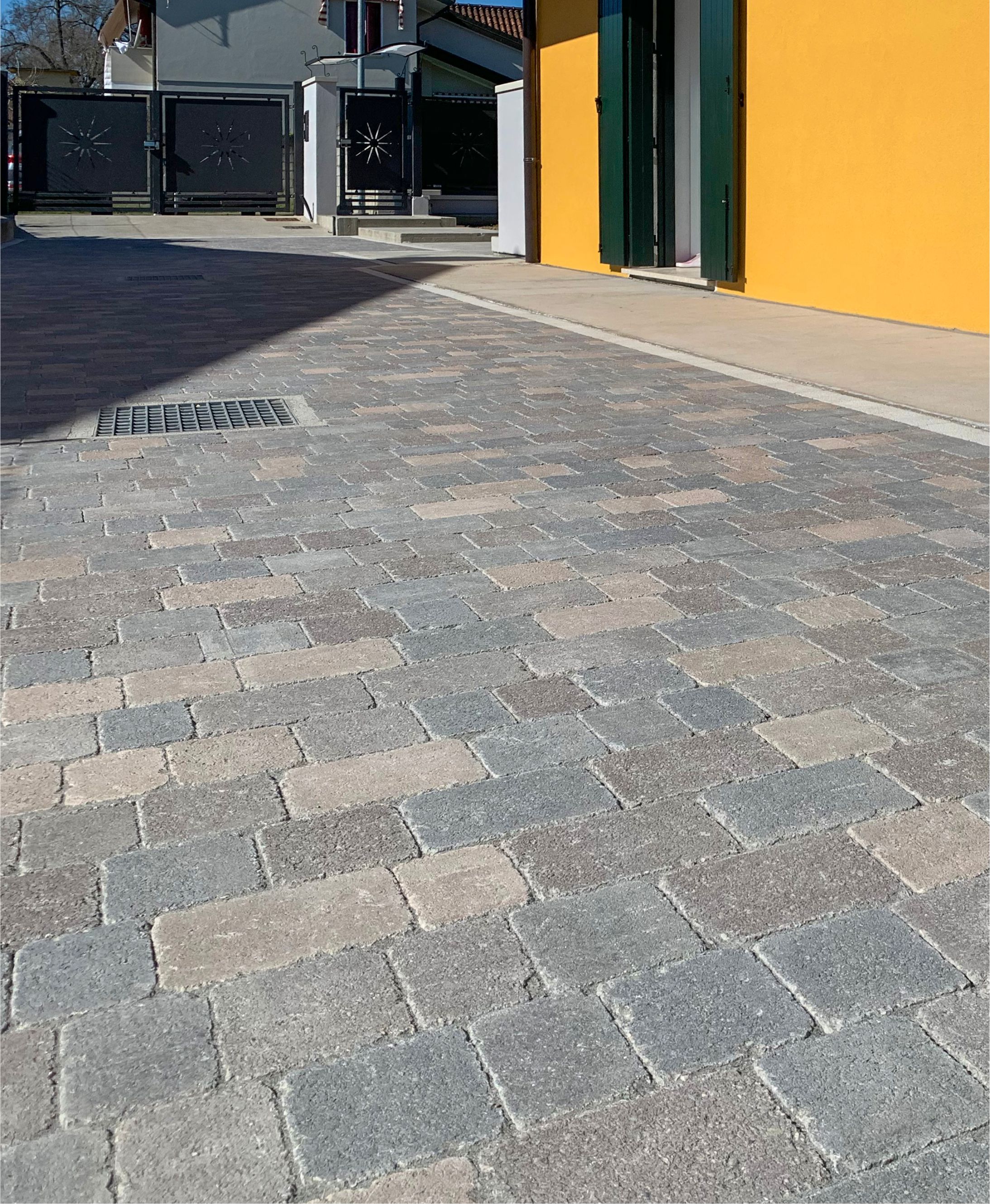 Pavimentazione dai bordi irregolari e anticati che ricorda le atmosfere delle antiche strade in pietra naturale.